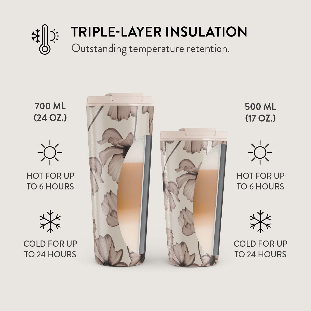 500 ml (17 oz.) Travel Mug: Keeps drinks hot for 6 hours. cold for 24 hours.
