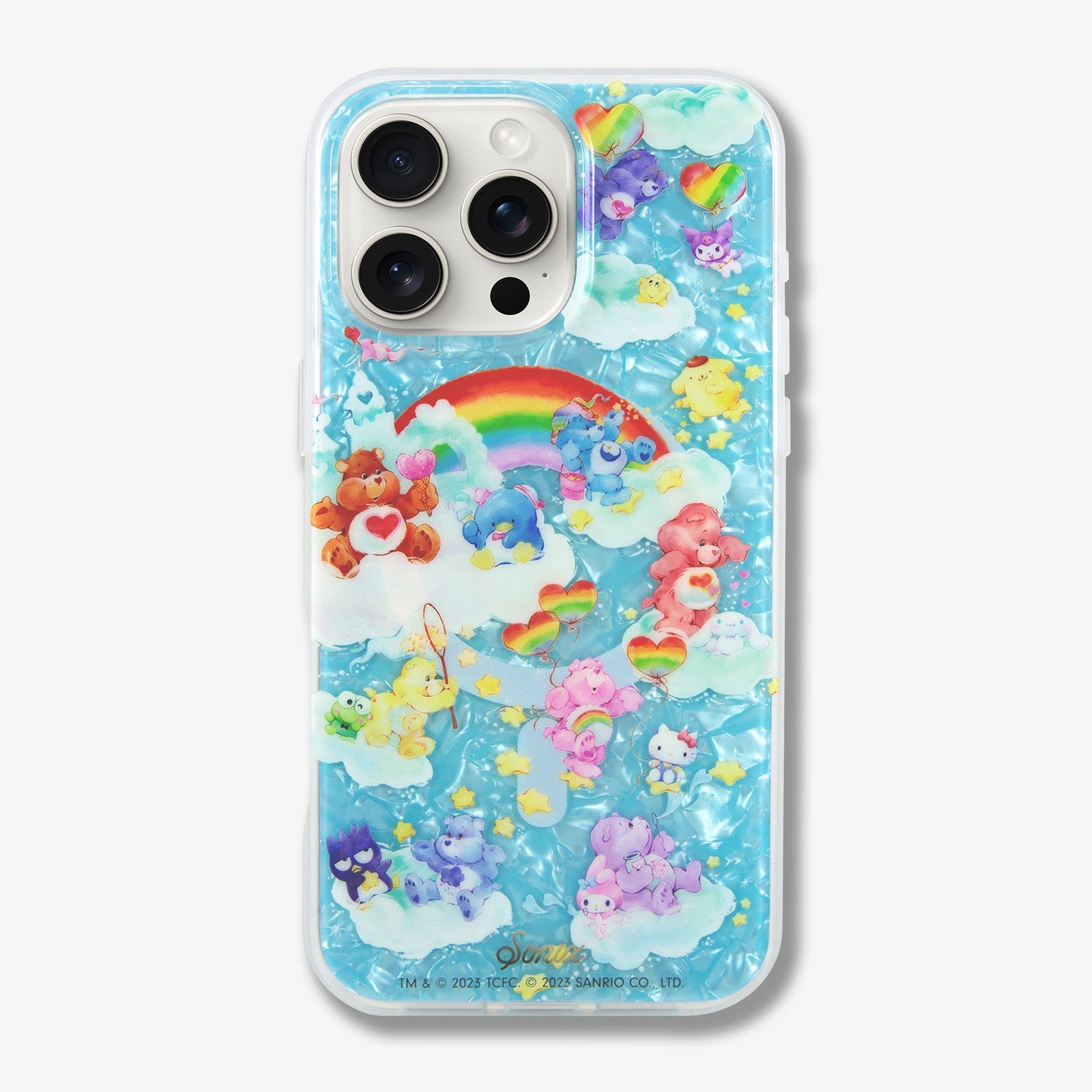 This Care Bears™ + Hello Kitty® and Friends MagSafe® Compatible iPhone case features our favorite friends from both worlds. working together in a dreamlike space of rainbows and clouds. With a background of shimmering sky blue tort. this case brings the sparkle with it wherever it goes. And. the cast of colorful characters makes it clear that all feelings and friends are welcome in a land inspired by generosity. caring. and teamwork. From Love a Lot™ Bear to Kuromi™. Grumpy Bear™ to My Melody™. a Sleepy Bear™ to hopping Keroppi™. every personality and mood is welcome here.