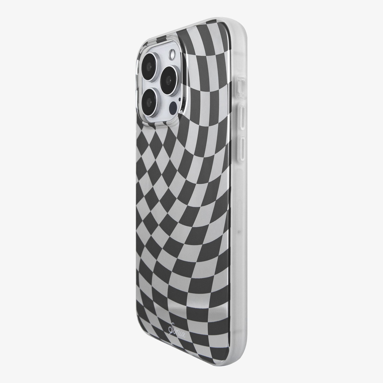 The chessboard is often used to symbolize a person’s internal struggle and attempt to find balance. After the last few years. we think a twisted checkerboard sounds about right for most of us. And. not only is the pattern appropriate for our attempts to find stability. the form is beautiful too. The Checkmate Black / Silver MagSafe® Compatible iPhone Case features a clear backdrop that incorporates the color of your device into the landscape of the game. With black squares alternating against the clear spaces. and a slow warp towards the camera lens. we think this design turned out to have levels of symbolism we didn’t initially imagine.
