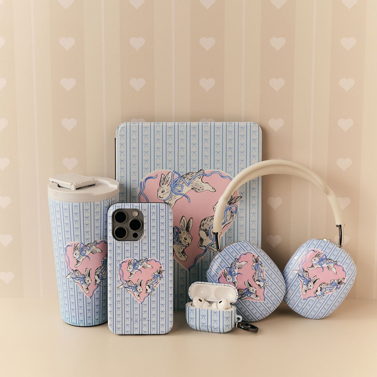 This design features: white rabbits. heart frame. blue stripes