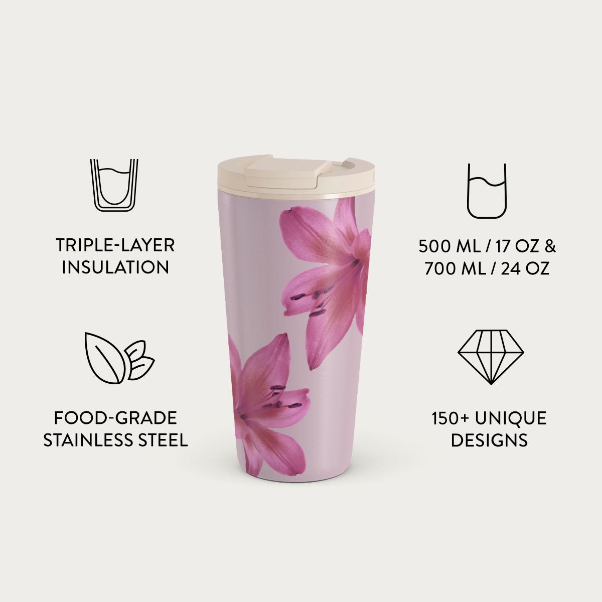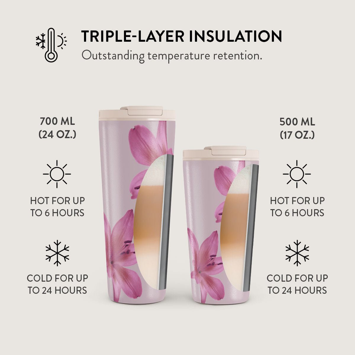 500 ml (17 oz.) Travel Mug: Keeps drinks hot for 6 hours. cold for 24 hours.