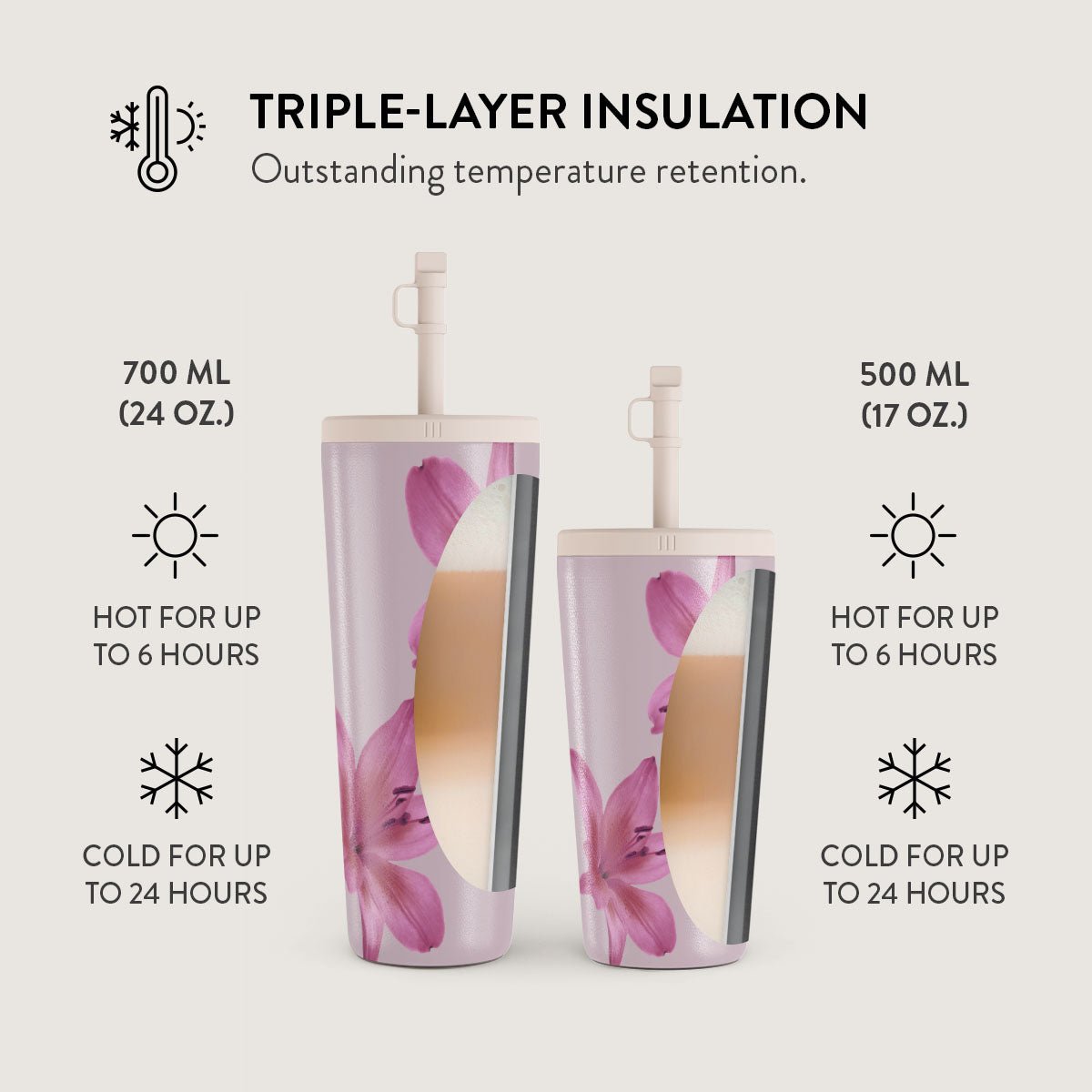 700 ml (24 oz.)Travel Mug: Keeps drinks hot for 6 hours. cold for 24 hours.