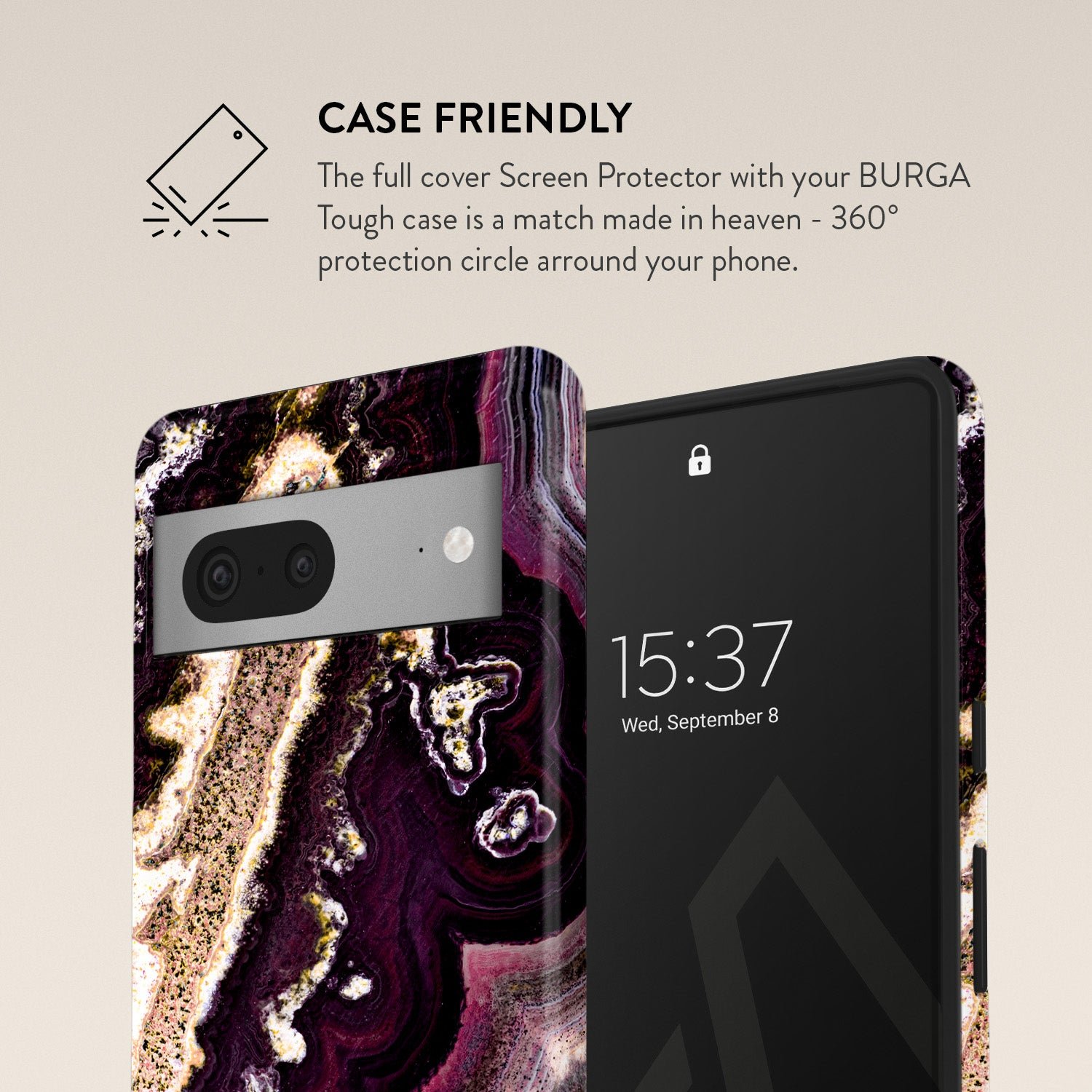 The full cover Screen Protector on your Burga Tough Case is like butter on your toast – a match made in heaven. Not only is it super simple to apply with the included installation kit. but it completes the 360° protection circle around your phone. Total shock absorption front to back. No scratches. cracks. or dents. Complete durability. At the same time. it keeps the sleek look and feel. The screen protector is water resistant and ultra-thin. too. preserving that crucial touch sensitivity.