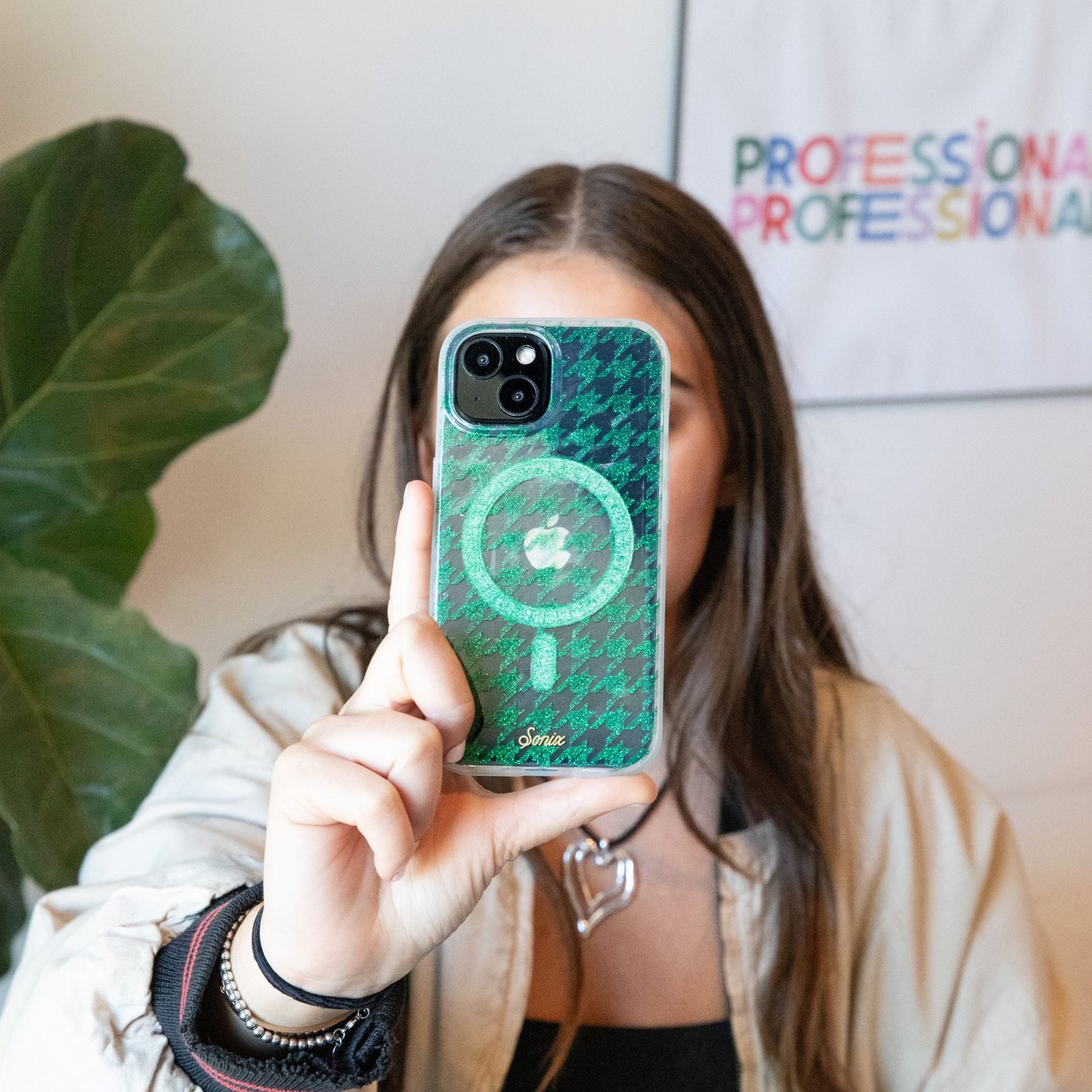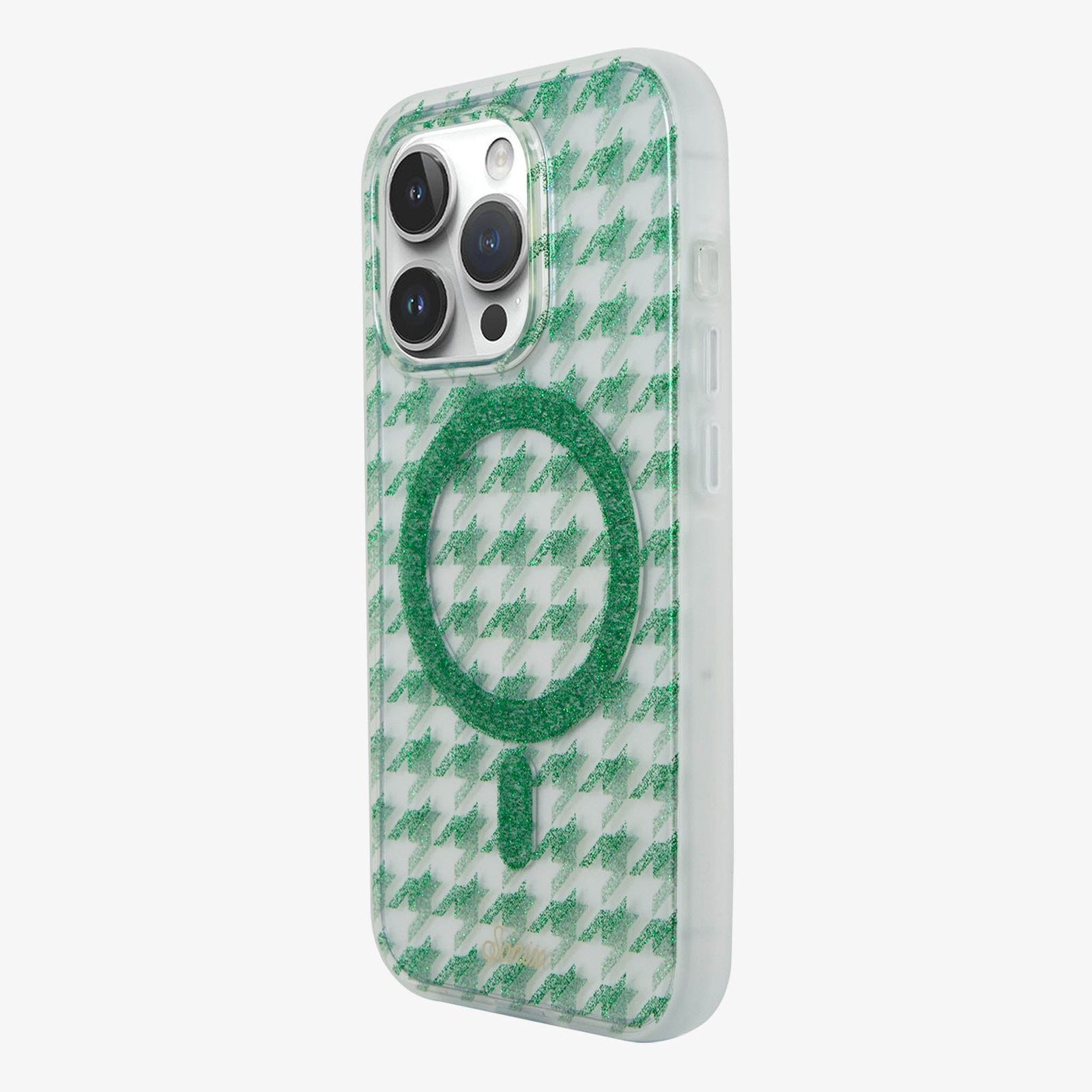 Named literally after the uneven shape of the hound dog’s teeth. the Houndstooth print has been a fashion staple since the 1800’s. And. we combined the classic Scottish pattern with a deep celtic green to make this MagSafe® Compatible iPhone case an amazing accent piece to any wardrobe. With the houndstooth layered onto a clear case. the background of your phone adds an individualized flair to the time-tested print. while a bit of green glitter brings a sprinkle of personality to this quintessential design.