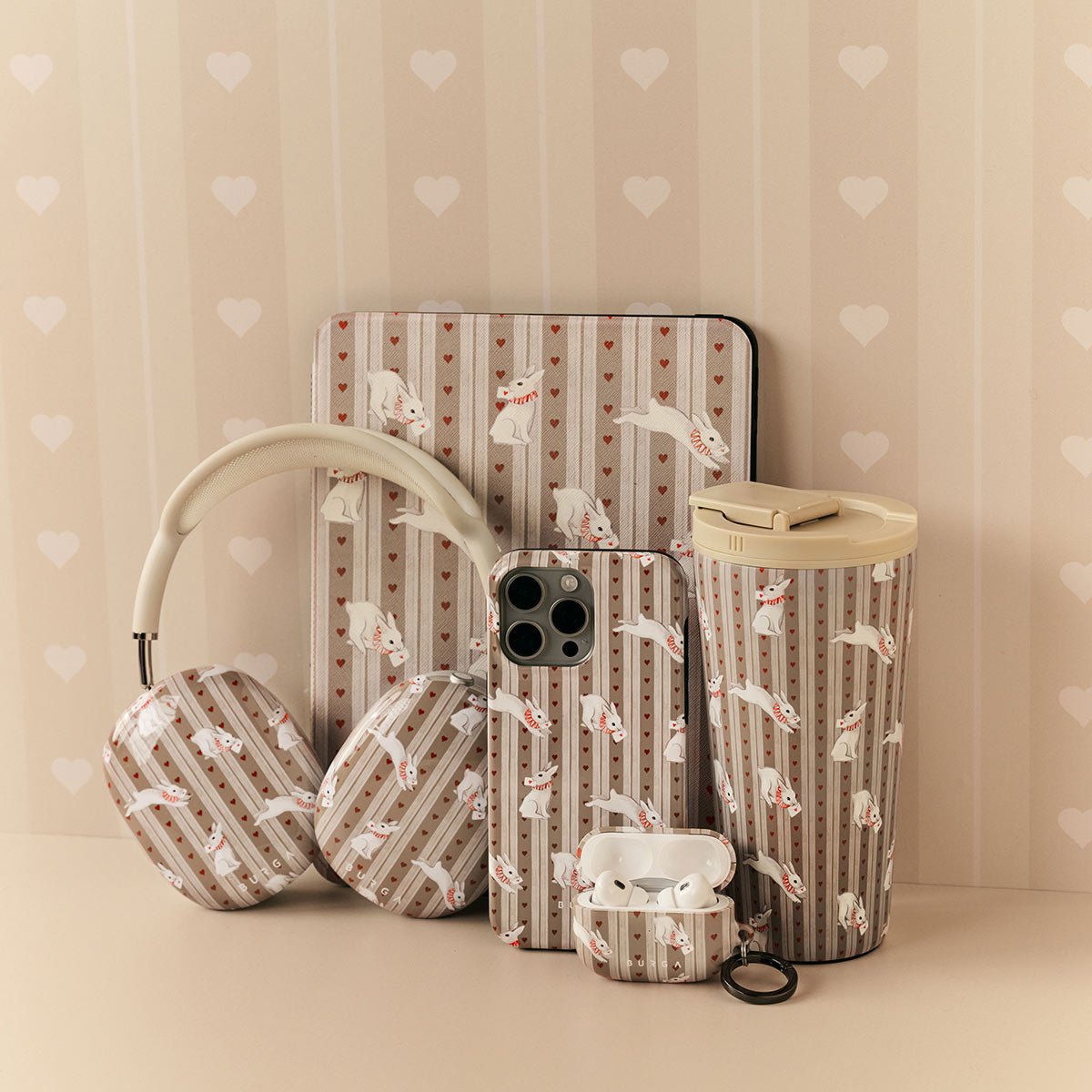 This design features: white rabbits. hearts. love. letters. vintage stripes