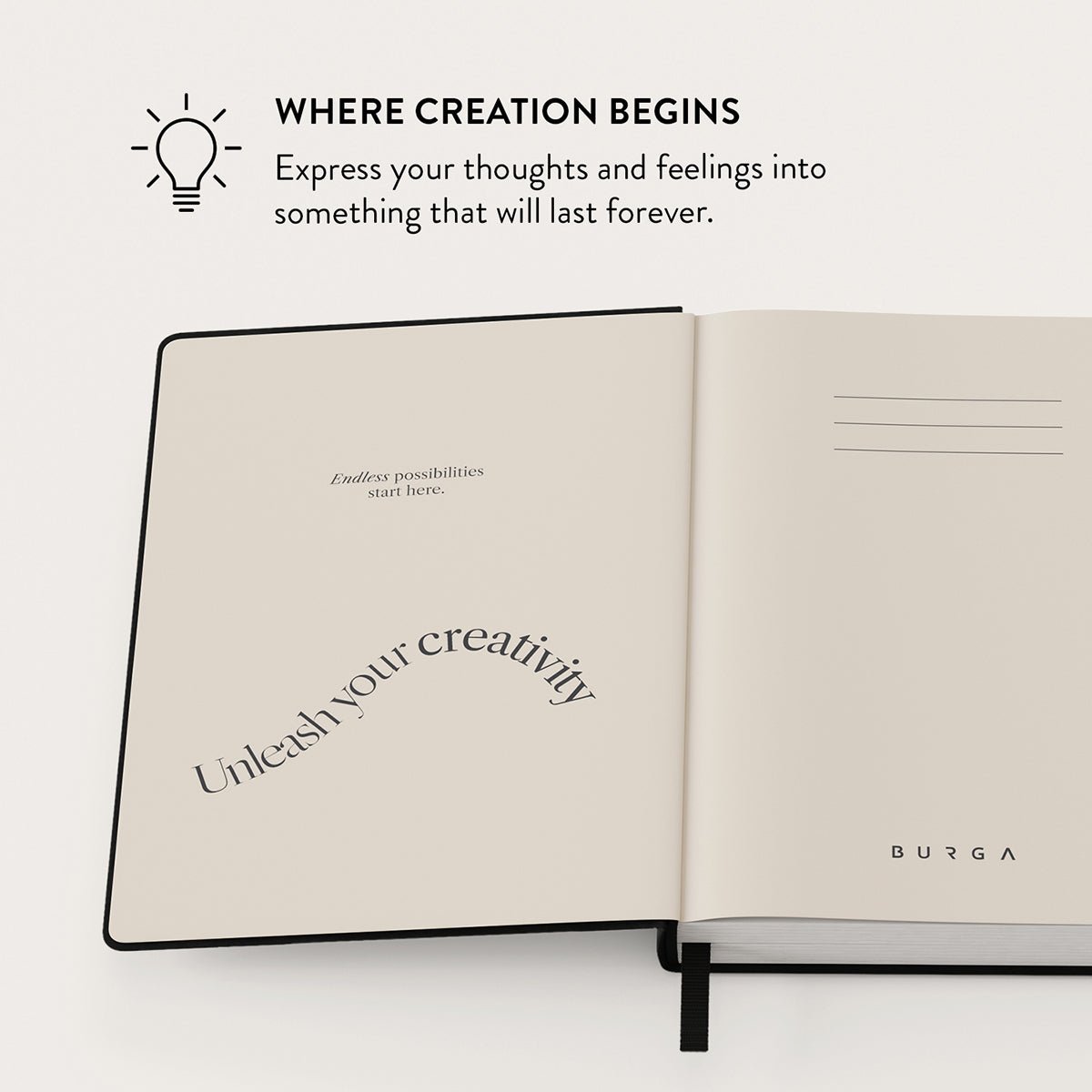 Features well-detailed BURGA patterns to a vegan faux leather front cover. Topped with an elegant black ribbon page marker.