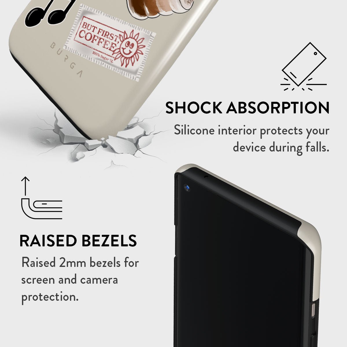 This design features: moka pot. frappe. cinnamon roll. chocolate heart. Not a morning person sticker. But First. Coffee receipt. music note