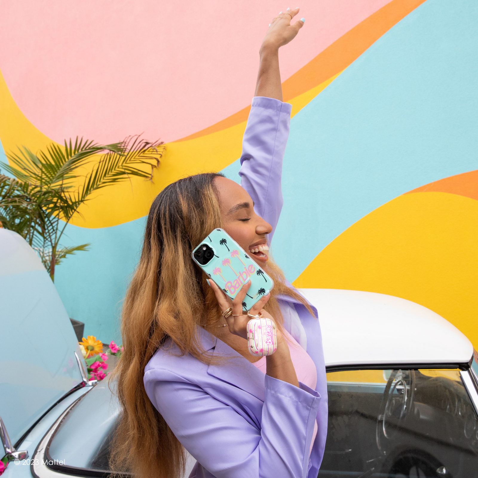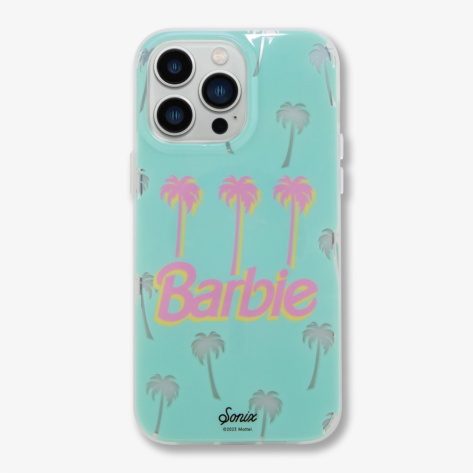 This MagSafe® compatible iPhone case features a vintage turquoise sky with palm trees outlined in pink and yellow. The palm trees are clear to showcase the color of your phone and brings the signature style of Barbie® to the forefront of this case.