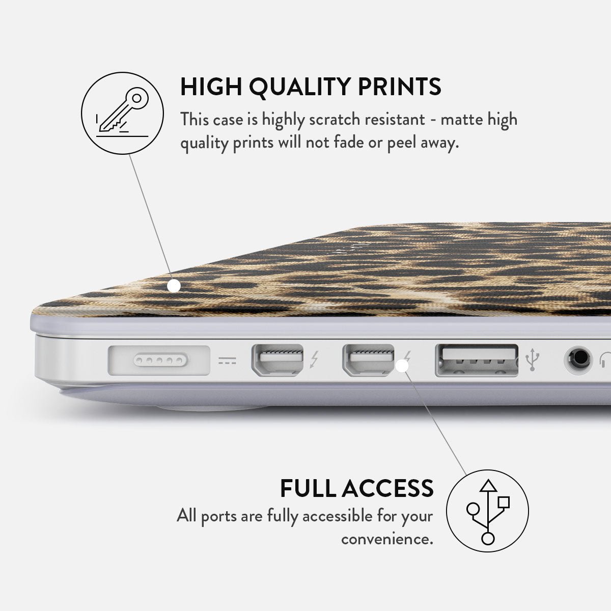 Either way. the BURGA MacBook case is the essential accessory for your everyday portable work-horse. It comes with two separate covers for the top and bottom of your laptop for that 360 protection. Despite this fact. it still maintains a slim profile and doesn’t make your MacBook feel bulky. The bottom cover also has a vent to keep your laptop from overheating when sitting. for example… well… on your lap! What else could you want from a MacBook cover? That’s right – easily accessible ports. Got that covered (or rather. NOT covered) as well.