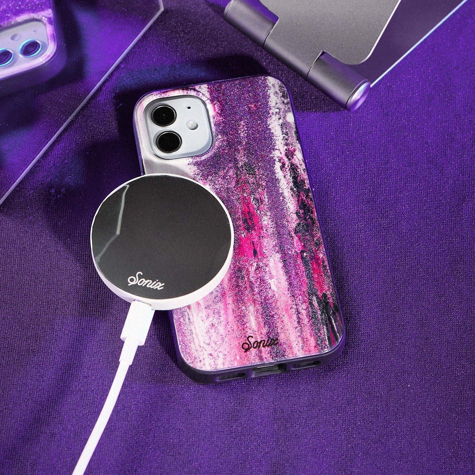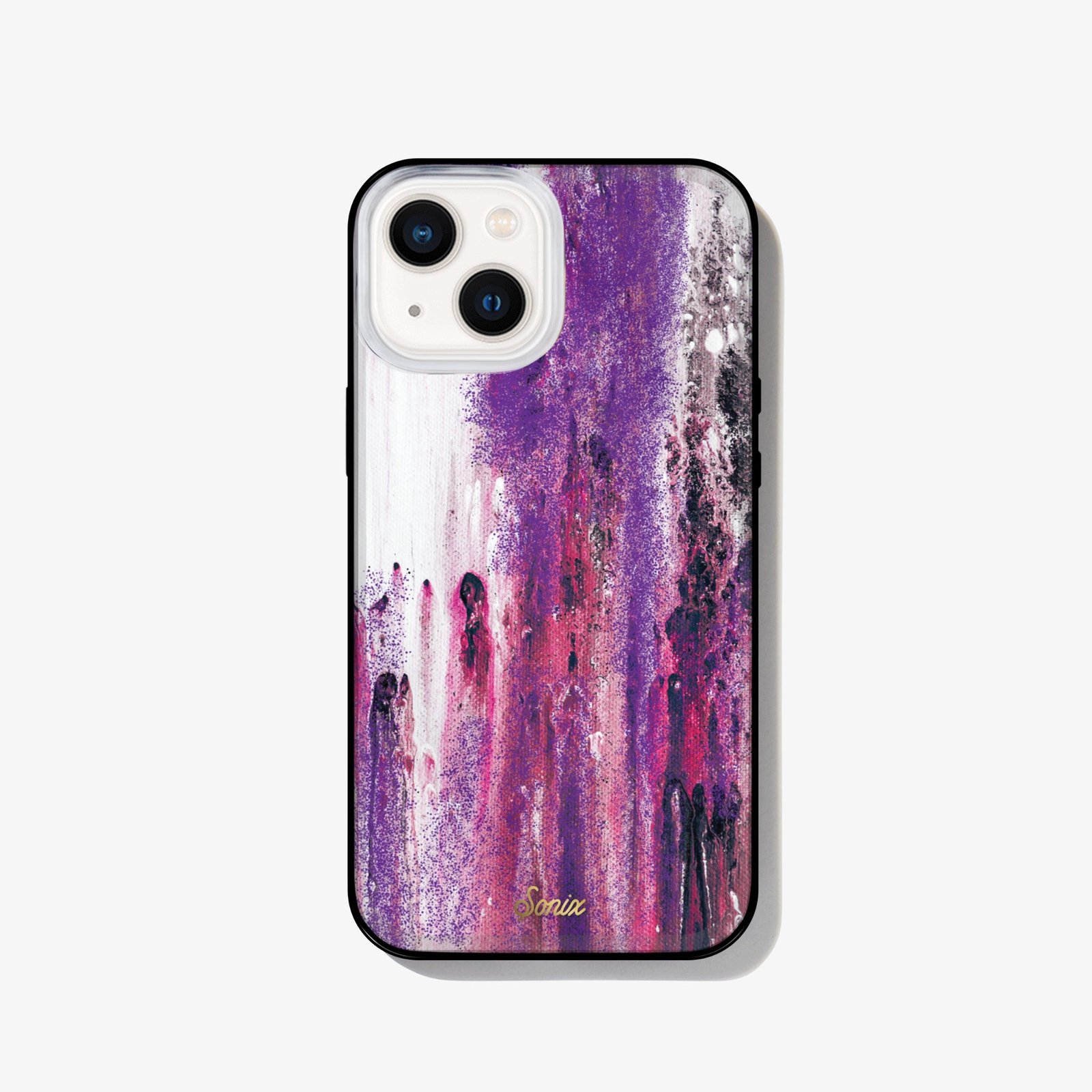 Purple Rain. MagSafe® Compatible iPhone case features a blend of magenta and purple brush strokes with purple glitter to finish.