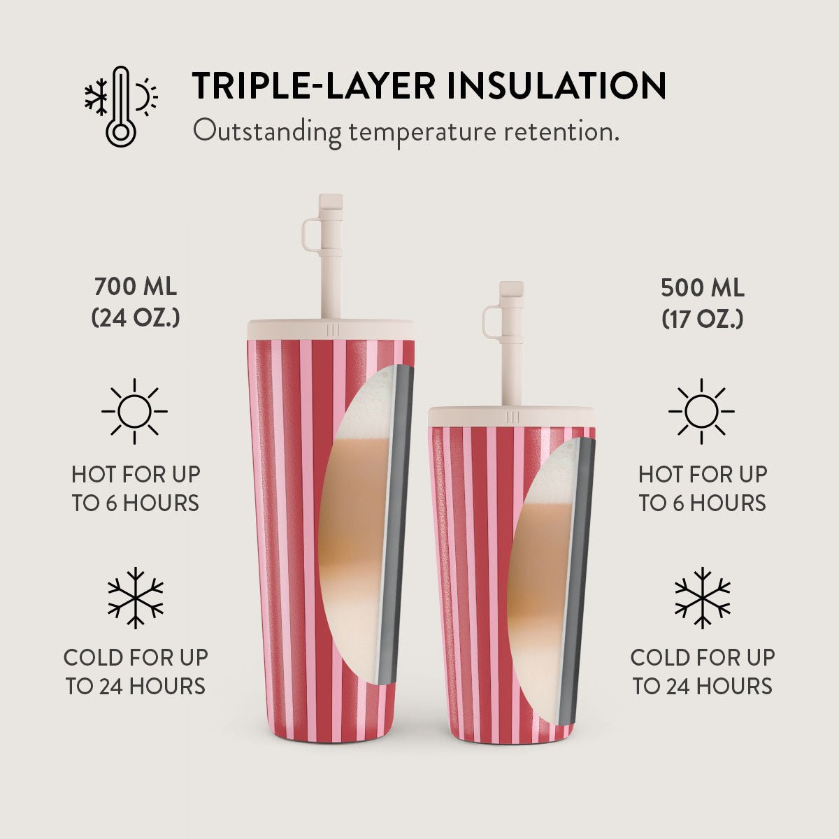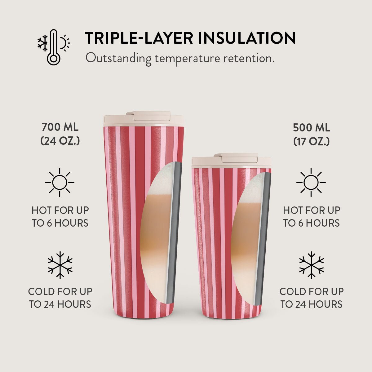 700 ml (24 oz.)Travel Mug: Keeps drinks hot for 6 hours. cold for 24 hours.