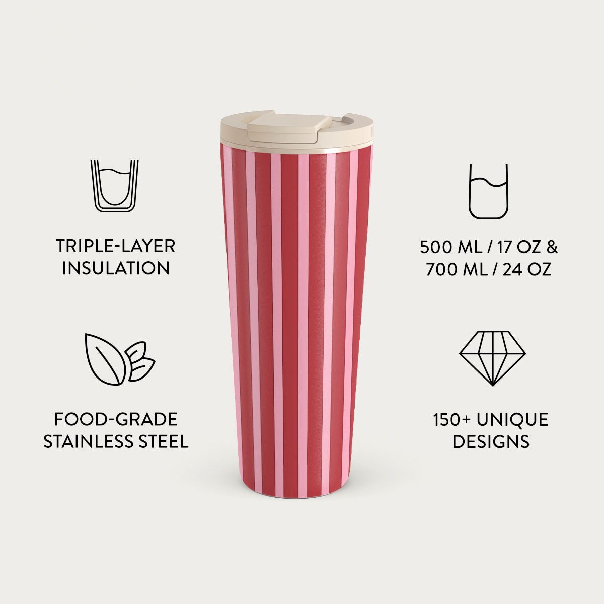 500 ml (17 oz.) Travel Mug: Keeps drinks hot for 6 hours. cold for 24 hours.