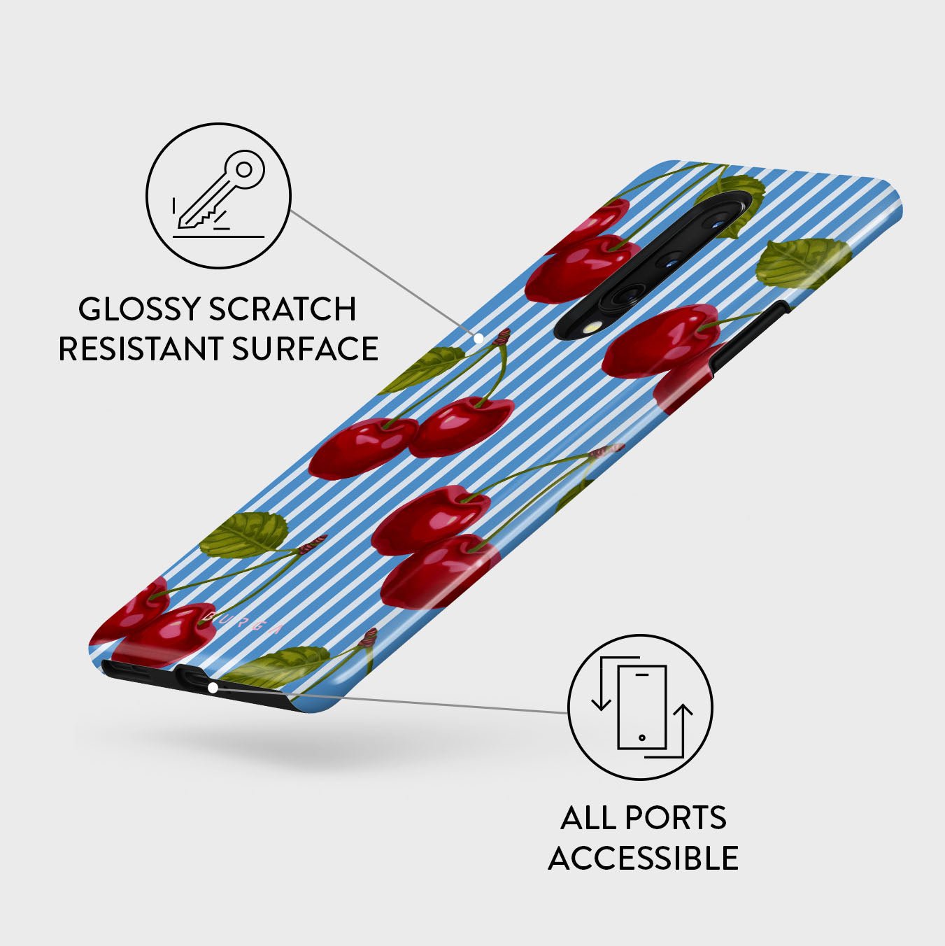 Cherries dangle like earrings from blue skies. a fun reminder of that first bite of summer. juicy and bursting with laughter. Meet our Sweet Moment OnePlus 8 phone case design.